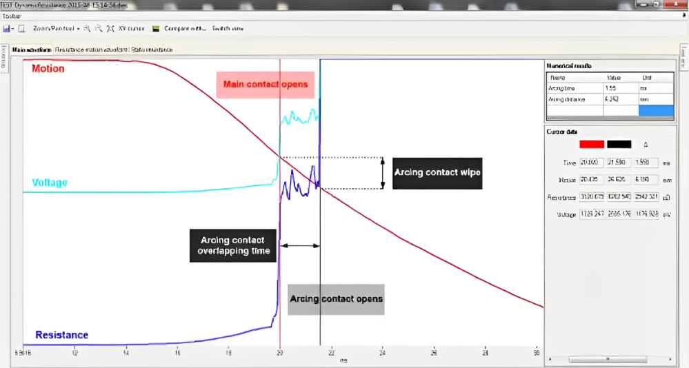 Medida de caída de tensión en el contacto y medida de desplazamiento permiten el cálculo de la penetración del contacto de arco