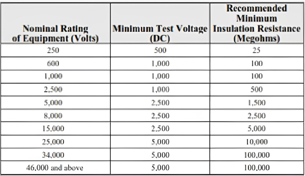 Tabla 100.1 «Insulation Resistance Test Values Electrical Apparatus and Systems Other Than Rotating Machinery» Bajo la norma ANSI/NETA MTS.
